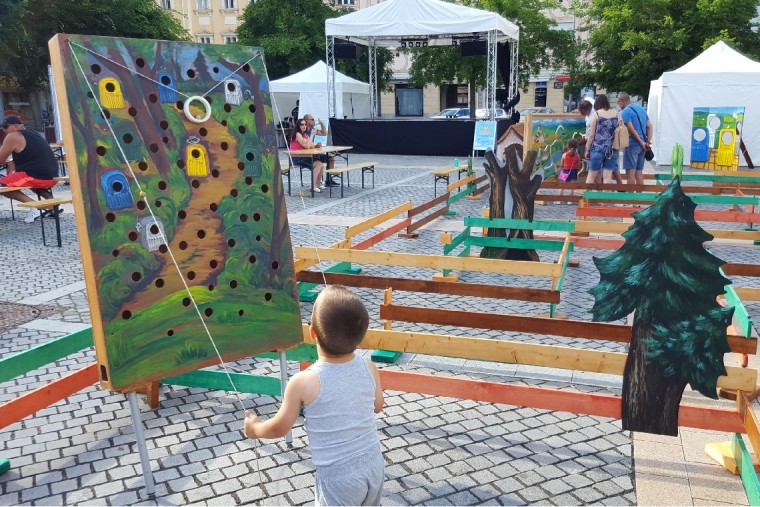 Két kéz koordinációs játék, ahol a megfelelő színű golyócskát a szelektív kukák színei szerinti lukakba kell bevezetni az óriás nagy fa táblán.
